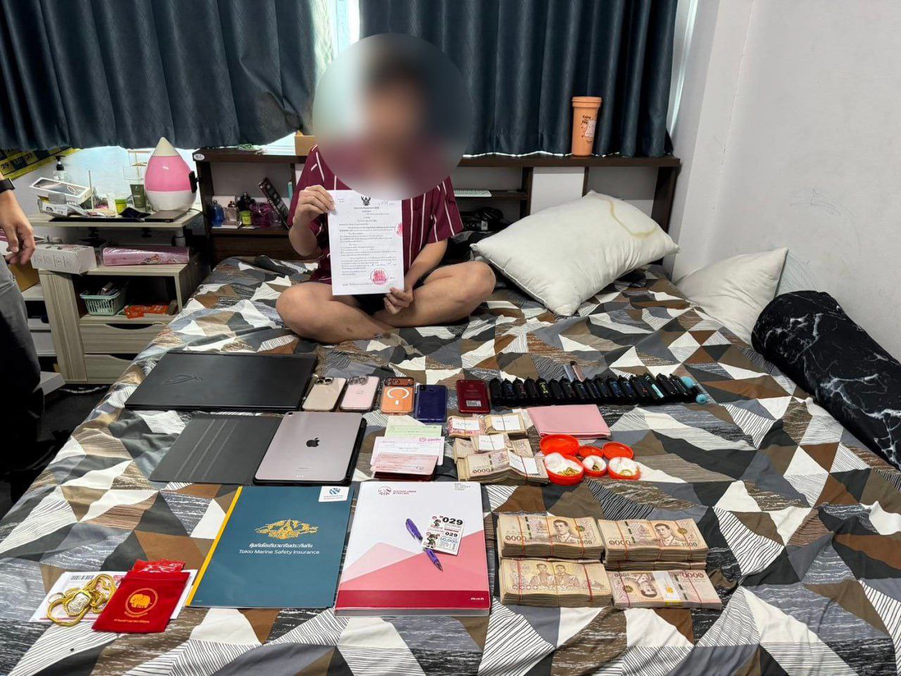 在突击搜查中,警方查获了大量与犯罪活动相关的证据,包括25台用于运营赌博网站的电子设备、价值140万泰铢的现金,以及金条和珠宝等贵重物品。据调查,该非法赌博网站拥有超过一万名注册会员,提供包括足球投注、老虎机等多种赌博活动,月营业额高达500万泰铢以上,显示出其规模庞大且运作复杂。