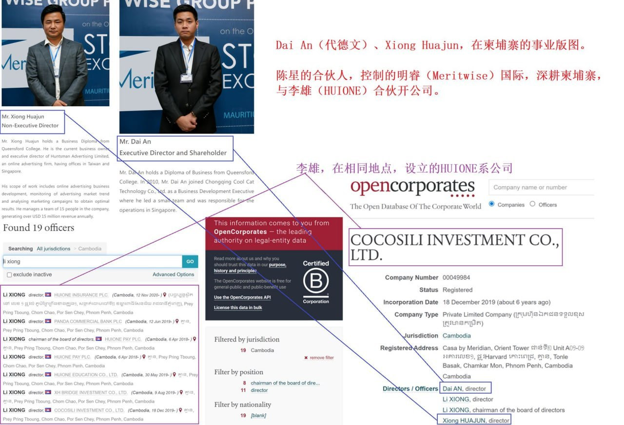 在柬埔寨,李雄与代德文共同设立Cocosili投资公司。其中,代德文在入籍柬埔寨后改名为Dai An。据称,代德文担任柏思睿特公司的总经理及核心投资人。该公司与胡小伟投资的迪渤森公司,在同一栋楼内办公。